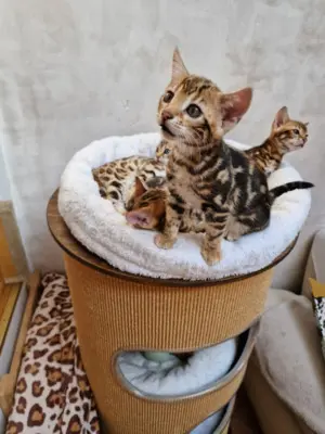 Sind diese Kitten nicht ein Traum! Da sich bekanntermaßen alle Babys viel vom Verhalten ihrer Mütter abschauen sind unsere Kitten besonders vielversprechend, da unsere Mädels bislang jeden mit ihrem sanftmütigen und liebevollen Wesen verzaubert haben. Sie sind sehr vorbildliche und besonders liebevolle Mütter, die ihren Nachwuchs perfekt im Griff haben. In unserer Cattery legen wir großen Wert auf eine sehr gute Sozialisierung der Jungtiere, welche gerade bei den Bengalen von besonderer Bedeutung ist! Die Kitten werden liebevoll und behütet im Wohnzimmer, mit regem Kontakt zu Menschen aufgezogen, und auch der Papi lebt mit uns im Haus, darauf legen wir besonders großen Wert. Wir legen großen Wert auf einen guten Kontakt zu den Käufern unserer Kitten - vor und auch nach der Abgabe der STUBENLEOS (wenn gewünscht)!!! Natürlich achten wir bei der Planung von Verpaarungen auch darauf, ein optisches Optimum zu erreichen. Auch die Gesundheit der Elterntiere ist uns sehr wichtig. Unser Anliegen ist es, Katzenfreunden die Gelegenheit zu geben, ihr Leben mit schönen, wesensfesten, gesunden und lieben STUBENLEOS zu teilen. Wir möchten auch dazu beitragen, stetige Verbesserungen an dieser wundervollen Rasse zu sichern, wobei uns die Qualität der Tiere, die bei uns aufwachsen, mehr am Herzen liegt, als die Quantität. Wir züchten Bengalen seit über 15 Jahren mit exclusiver Rosetted- und Marble Zeichnung, leuchtend goldener bis orangebrauner Farbe und viel Glitter in den Fellspitzen. Unsere Katzen haben keinerlei grauen Einschlag in der Grundfarbe und die Fellqualität ist extrem kurz, besonders seidig und edel. Die Rosettenzeichnung sieht nicht verwaschen aus, sonders der Kontrast sticht hervor und ist vollkommen klar zu sehen. Abgabe erfolgt: - ab 13. Woche, hervorragend sozialisiert- mit Kaufvertrag (Kastration im Alter von 6 - 8 Monaten ist Bestandteil des Vertrages)- ab einem Alter von 3 Monaten sind unsere Kater grundsätzlich kastriert- mit einem 5- Generationen- Stammbaum - Gesundheits-Pass. Unser Nachwuchs besitzt folgende Impfungen: - 2 x Katzenschnupfen und Katzenseuche- bei Bedarf Tollwut - außerdem haben alle Abgabetiere einen implantierten Microchip und sind selbstverständlich Parasitenfrei- ein großes Futterpaket und die Schmusedecke ist jawohl selbstverständlich. Alle unsere Kitten werden von uns ins neue Zuhause gebracht, natürlich nach vorherigem KENNENLERNEN.